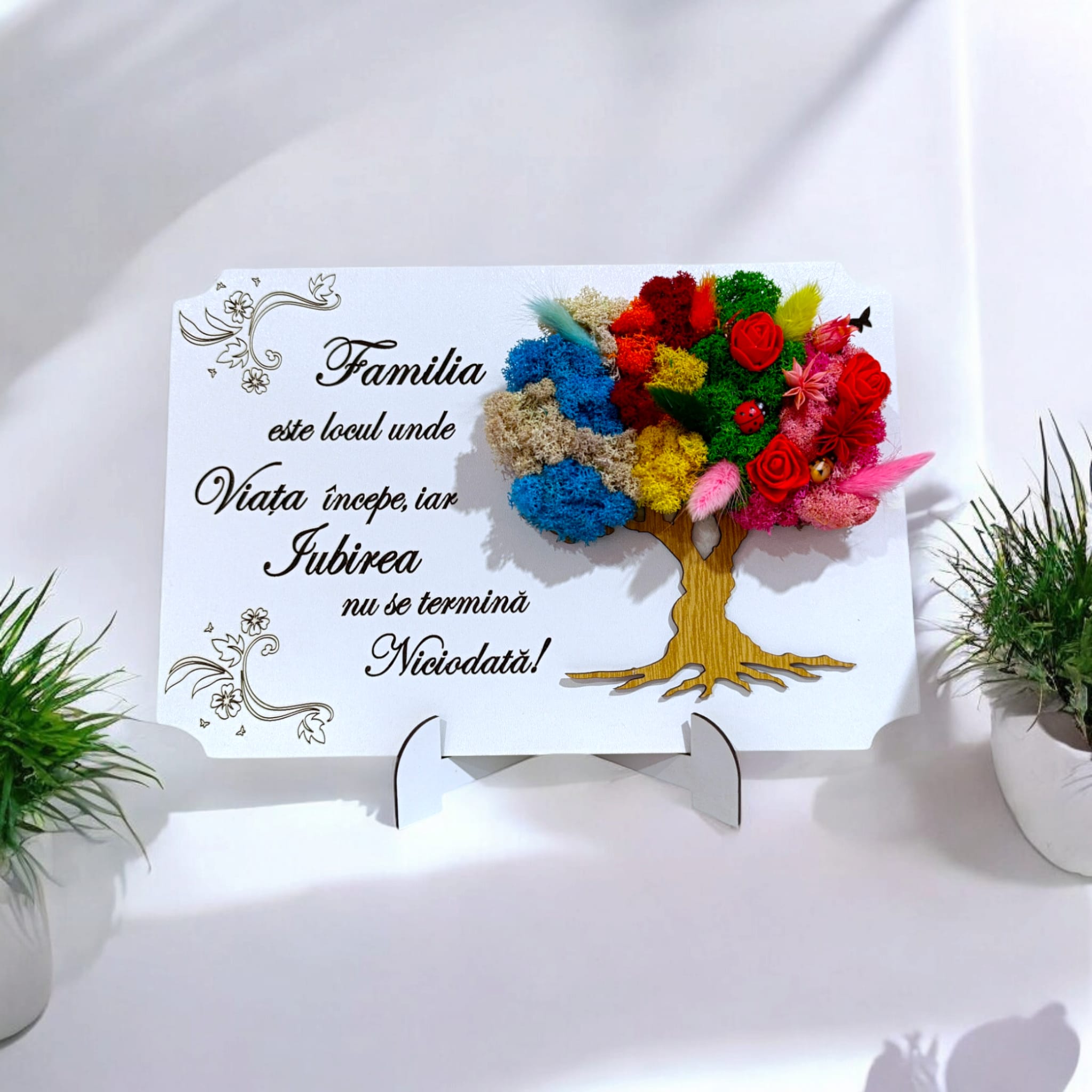 Tablou copac cu licheni stabilizati, personalizat cu mesaj standard, cadou pentru Familie, dimensiune 30x20cm, Alb
