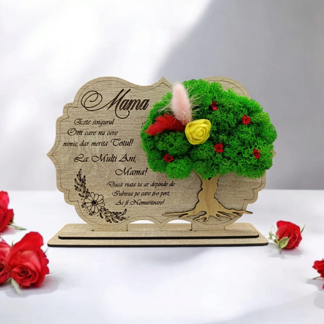 Tablou copac cu licheni stabilizati, cadou personalizat cu mesaj standard pentru Mama"Mama este singurul om care nu cere nimic..." Produs în România de Rustic Wood Decor