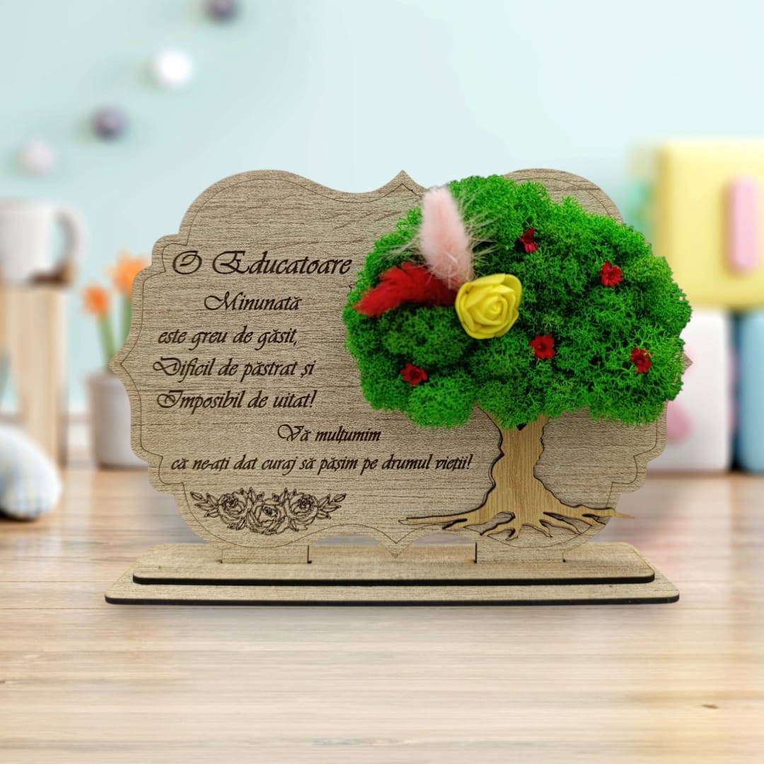 Tablou copac cu licheni stabilizati, cadou personalizat cu mesaj standard pentru Educatoare "O Educatoare minunata este greu de gasit..." Produs în România de Rustic Wood Decor