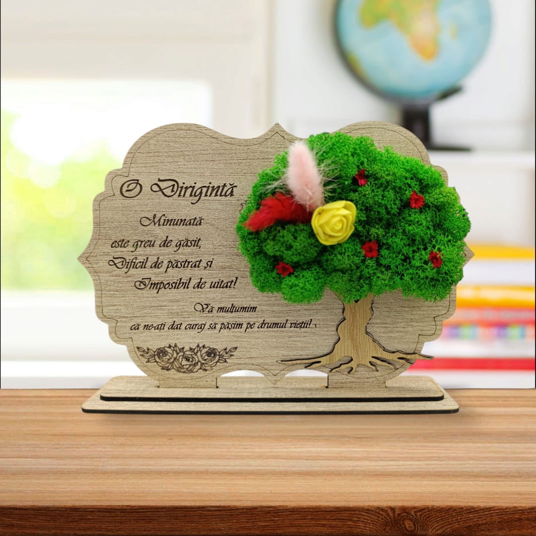 Tablou copac cu licheni stabilizati, cadou personalizat cu mesaj standard pentru Diriginta "O Diriginta minunata este greu de gasit..." Produs în România de Rustic Wood Decor