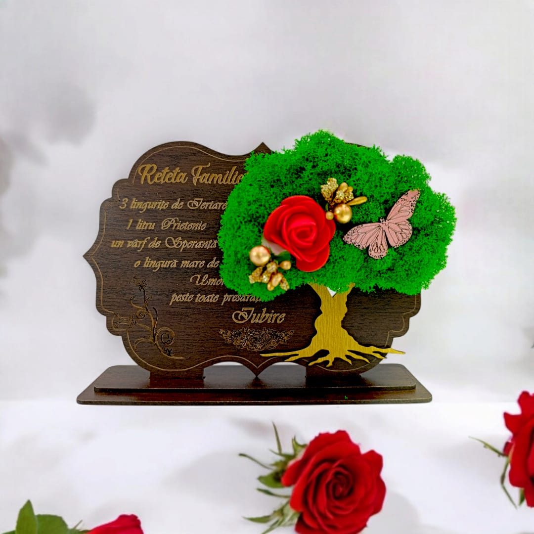Tablou copac cu licheni stabilizati, cadou personalizat cu mesaj standard "Reteta Familiei" Produs în România de Rustic Wood Decor