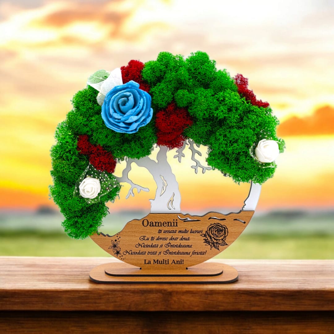 Tablou Copacul Vietii Cadou personalizat cu mesaj standard pentru Prieteni/Sotie/Fini/Familie/Nasi ”La multi ani!”, decorat cu licheni stabilizati Produs în România de Rustic Wood Decor