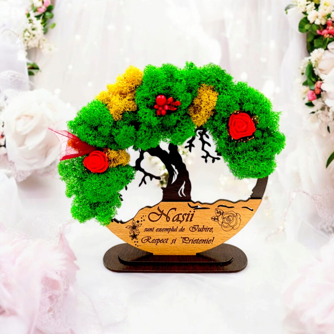 Tablou Copacul Vietii Cadou personalizat cu mesaj standard pentru Nași ,”Nașii sunt exemplul de Iubire, Respect și Prietenie!”, decorat cu licheni stabilizati Produs în România de Rustic Wood Decor