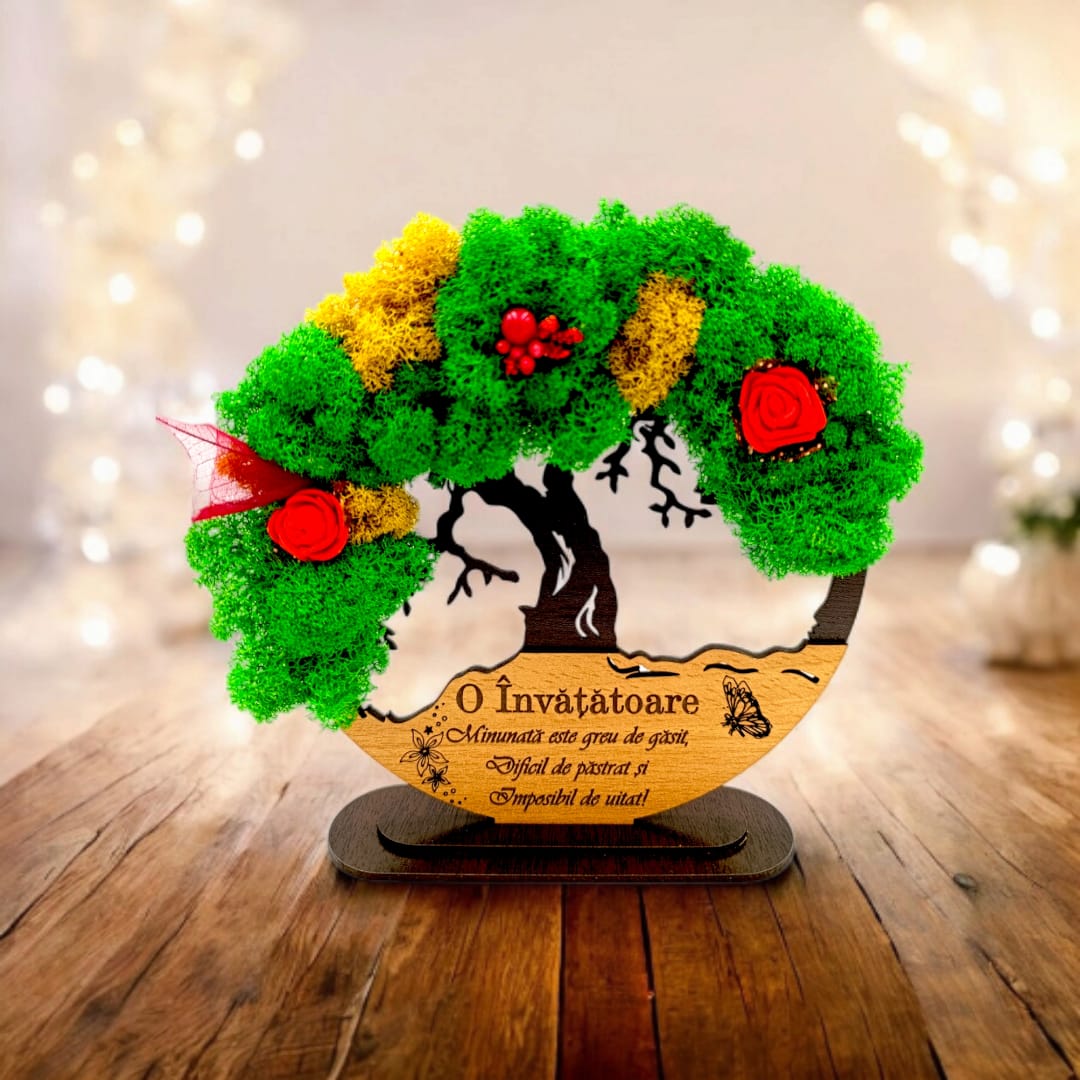 Tablou Copacul Vietii Cadou personalizat cu mesaj standard pentru Învățătoare ”O Învățătoare minunată este greu de găsit...” decorat cu licheni stabilizati Produs în România de Rustic Wood Decor