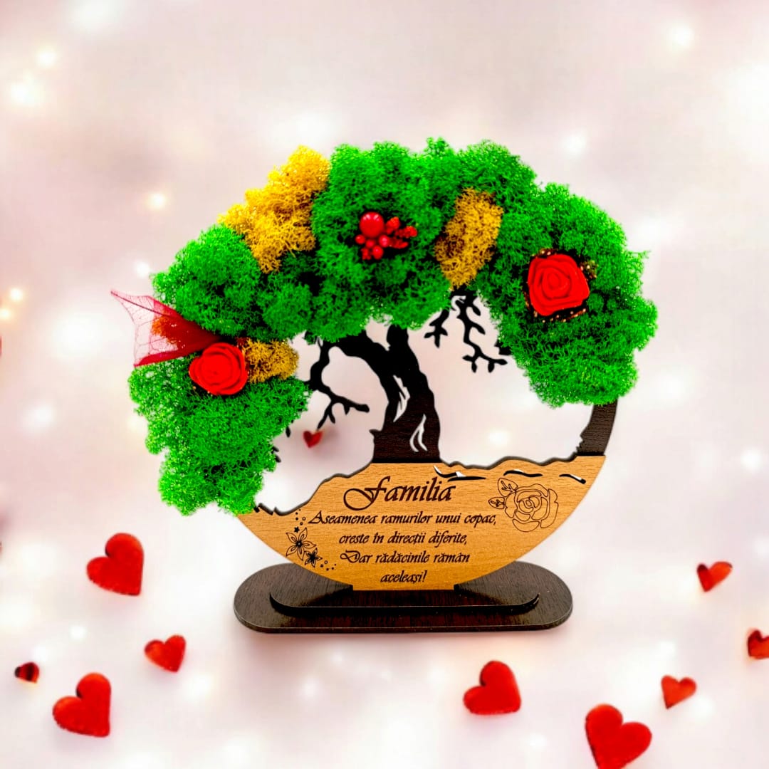Tablou Copacul Vietii Cadou personalizat cu mesaj standard pentru Familie ”Familia este asemenea ramurilor unui copac...” decorat cu licheni stabilizati Produs în România de Rustic Wood Decor