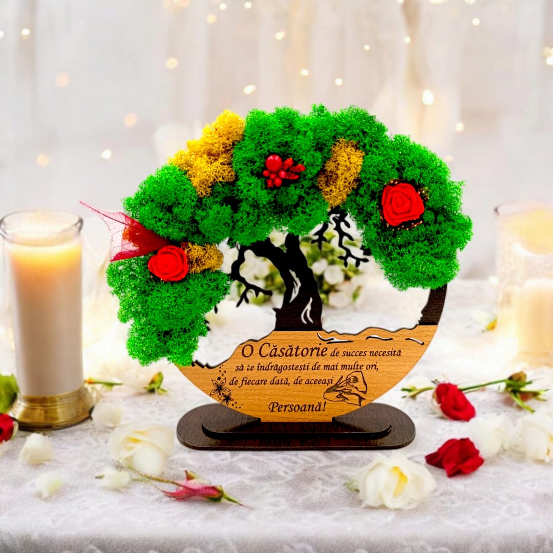 Tablou Copacul Vietii Cadou personalizat cu mesaj standard pentru Căsătorie ”O Căsătorie de succes necesită...” decorat cu licheni stabilizati Produs în România de Rustic Wood Decor