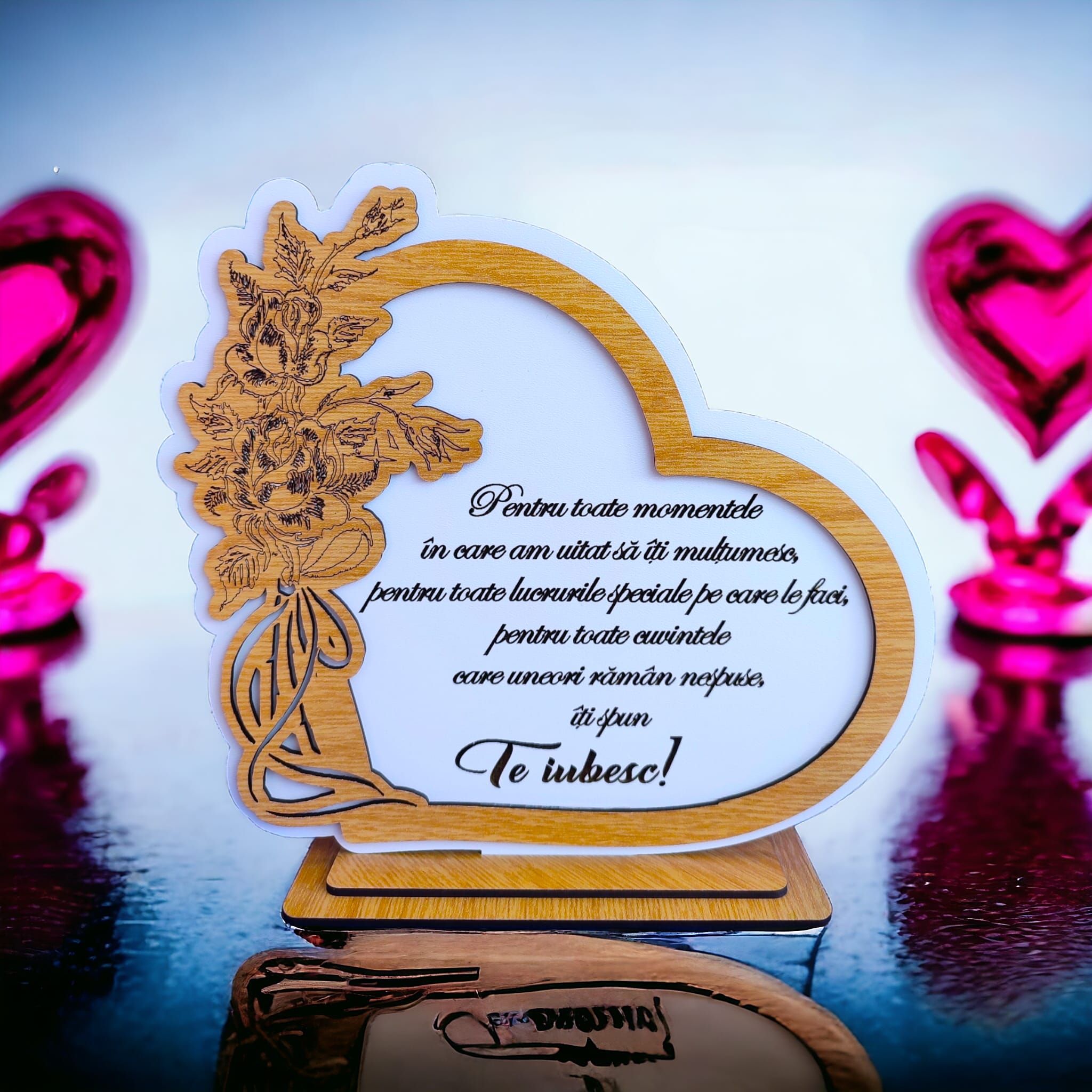 Decoratiune tablou inima personalizata cu mesaj standard, cadou, "Te iubesc!",baza cu suport din lemn, 22x20cm