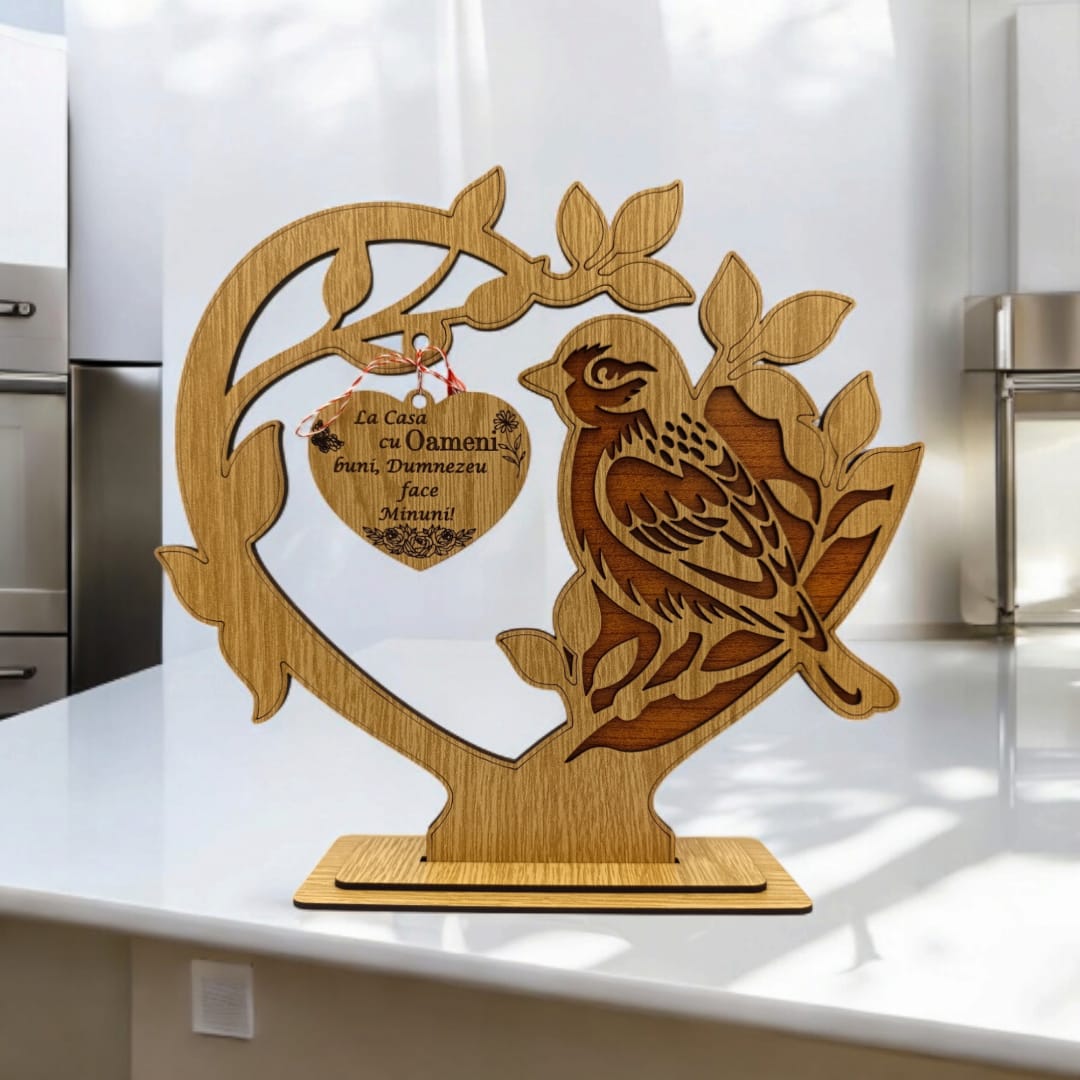 Cadou personalizat cu pasare in forma de inima, decoratiune cu mesaj standard pentru "La casa cu Oamenii Buni", dimensiune 19x22cm