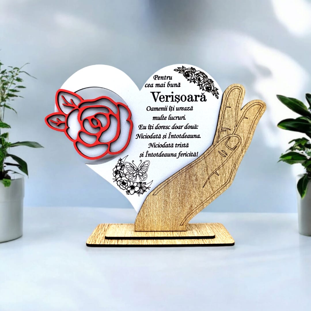 Cadou personalizat, tablou inima in palma cu mesaj standard "Cea mai buna Verisoara", 21x15cm