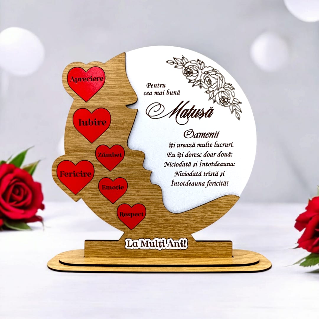 Cadou personalizat, tablou din lemn cu inimi rosii si mesaj standard pentru "Cea mai buna Matusa", maro