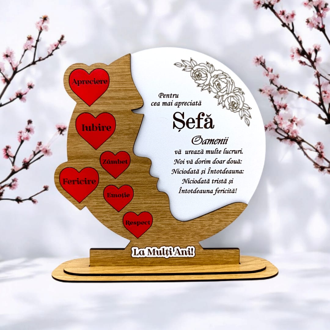 Cadou personalizat, tablou din lemn cu inimi rosii si mesaj standard pentru "Cea mai apreciata Sefa", maro