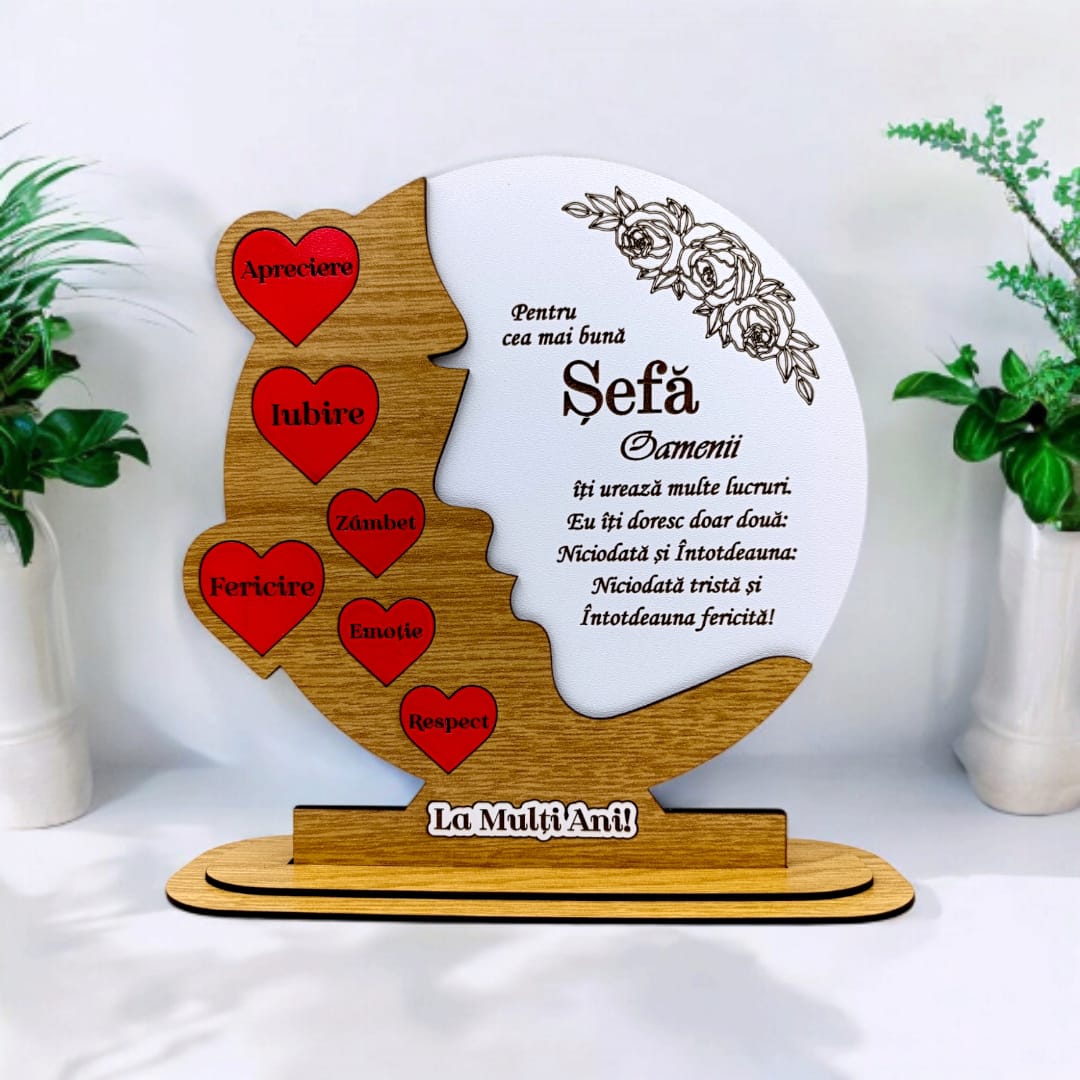 Cadou personalizat, tablou din lemn cu inimi rosii si mesaj standard pentru "Cea mai buna Sefa", maro