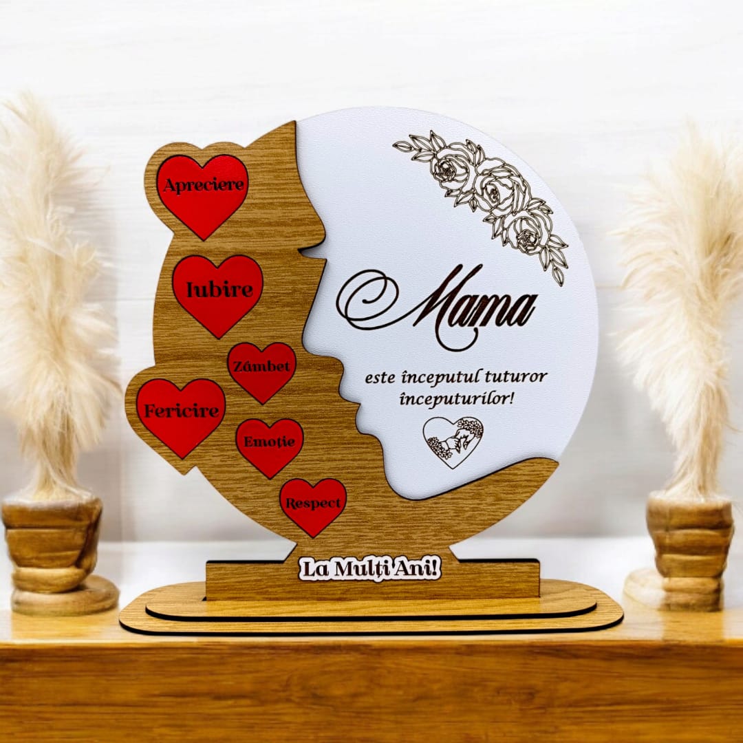 Cadou personalizat, tablou din lemn cu inimi rosii si mesaj standard pentru Mama, model 3, maro
