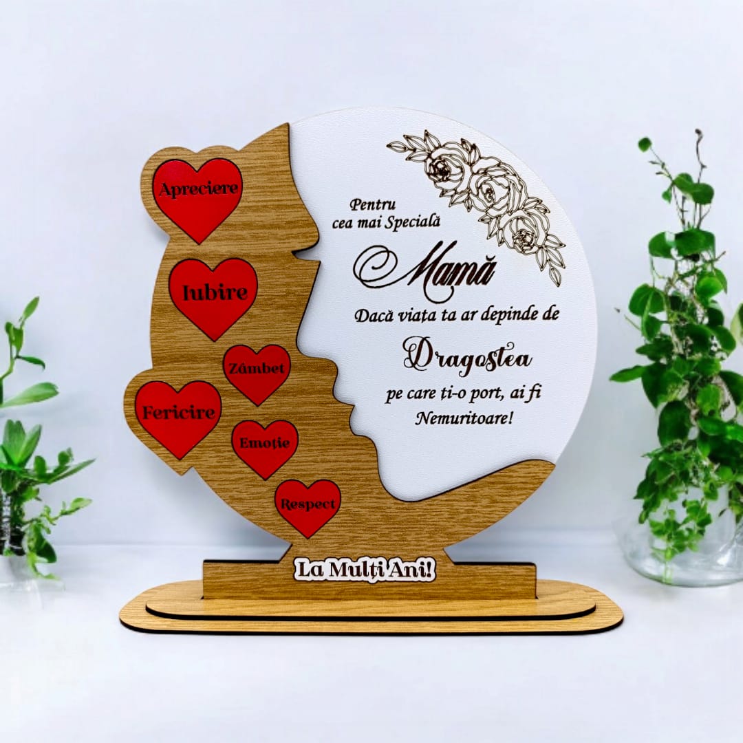 Cadou personalizat, tablou din lemn cu inimi rosii si mesaj standard pentru "Cea mai speciala Mama", maro