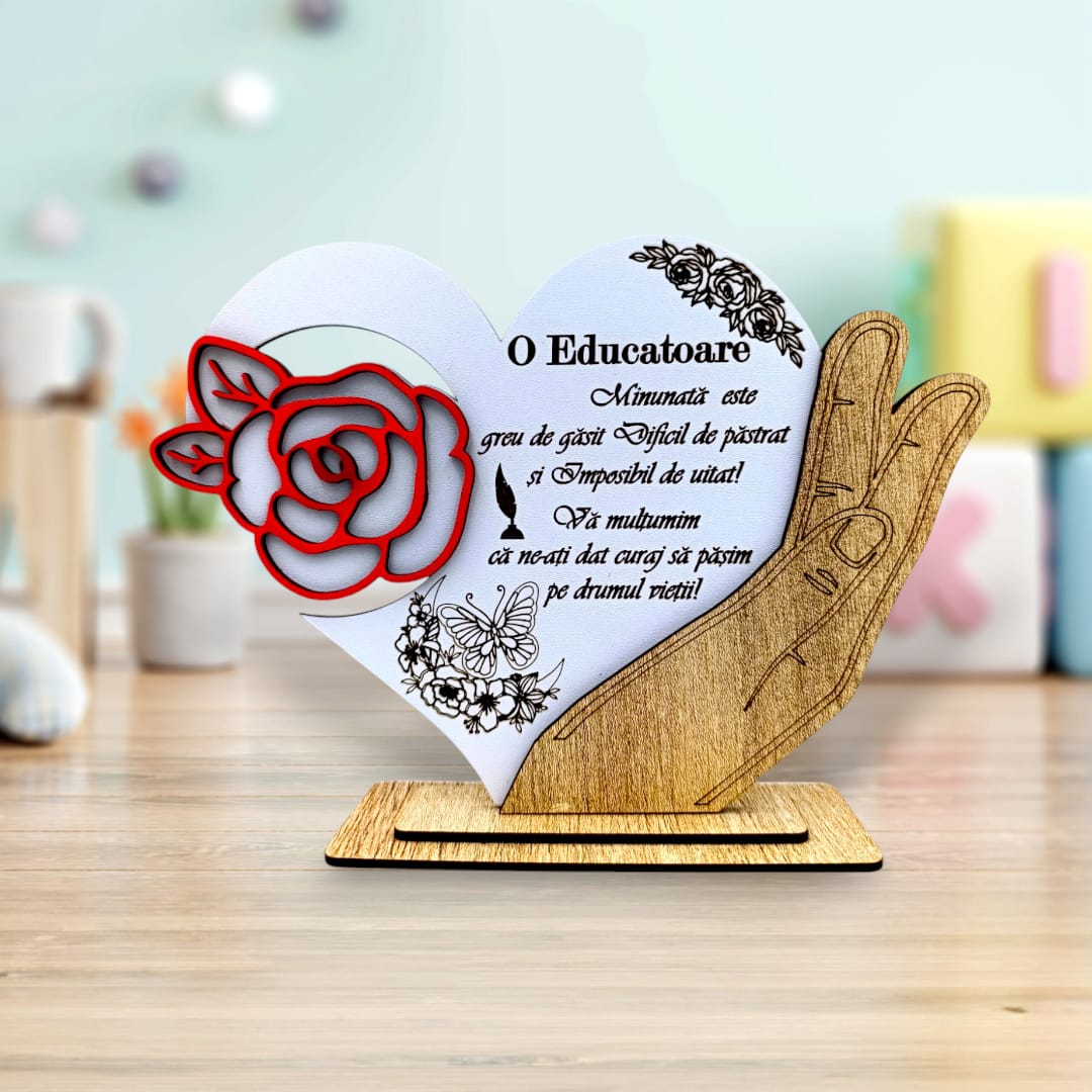Cadou personalizat, tablou inima in palma cu mesaj standard pentru Educatoare, 21x15cm