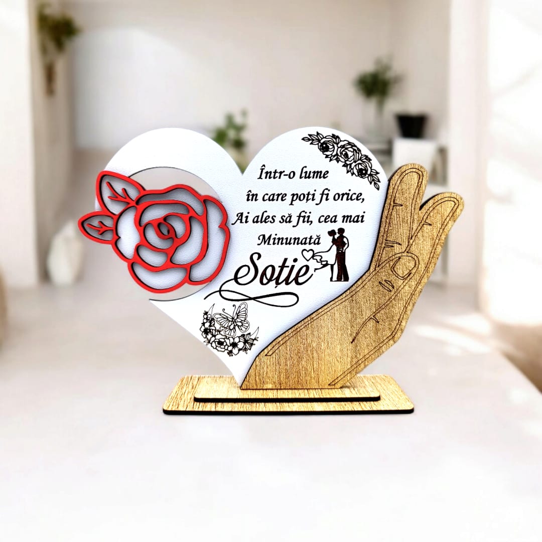 Cadou personalizat, tablou inima in palma cu mesaj standard pentru "Cea mai minunata Sotie", 21x15cm