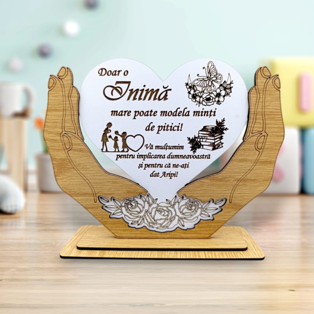 Decoratiune Tablou Inima in palme, cadou personalizat cu mesaj standard "Doar o Inimă mare poate modela minti de pitici!" dimensiune 20x15cm