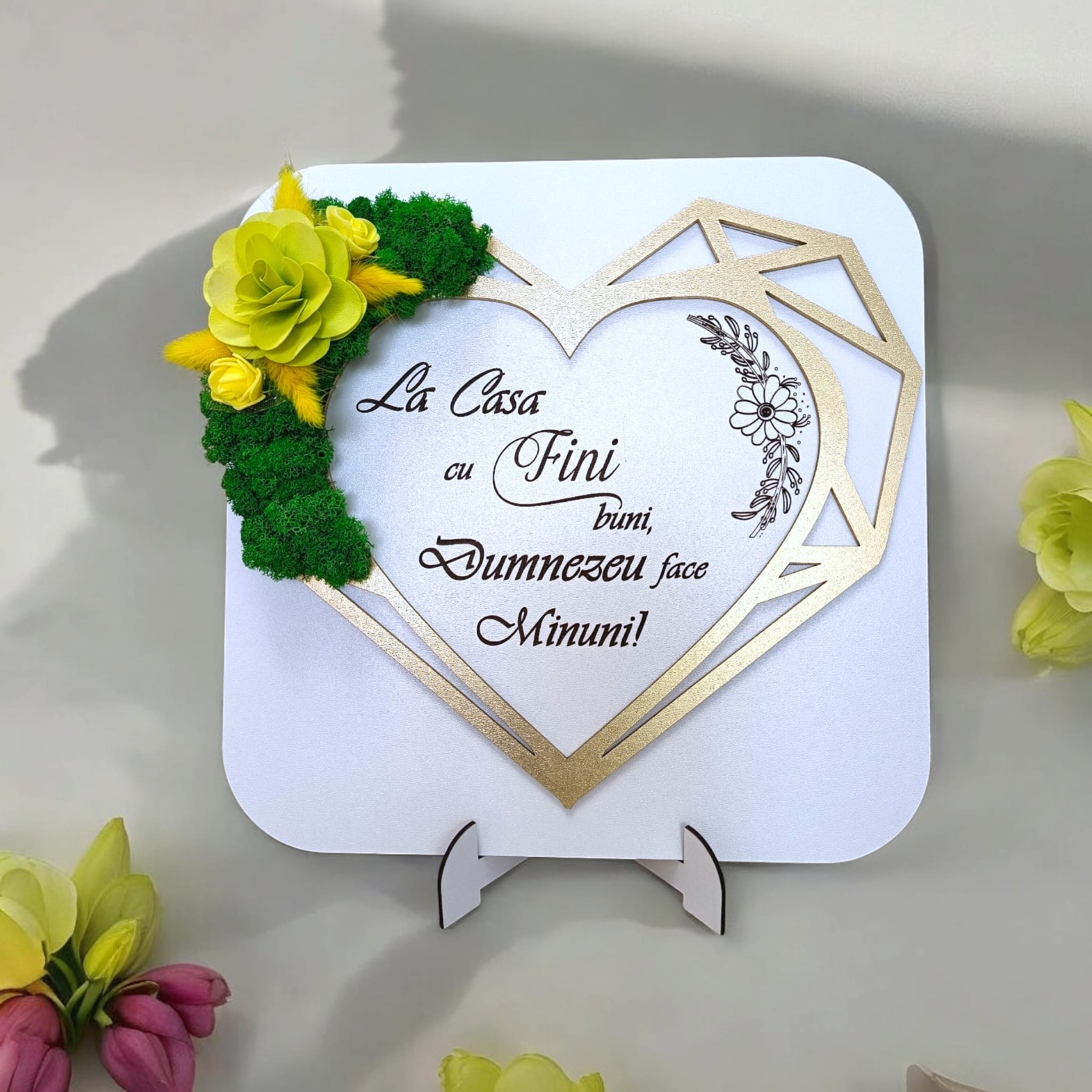 Tablou decorativ personalizat pentru Fini, decorat cu licheni stabilizati, cu design in formă de inimă geometrica– Produs în România de Rustic Wood Decor