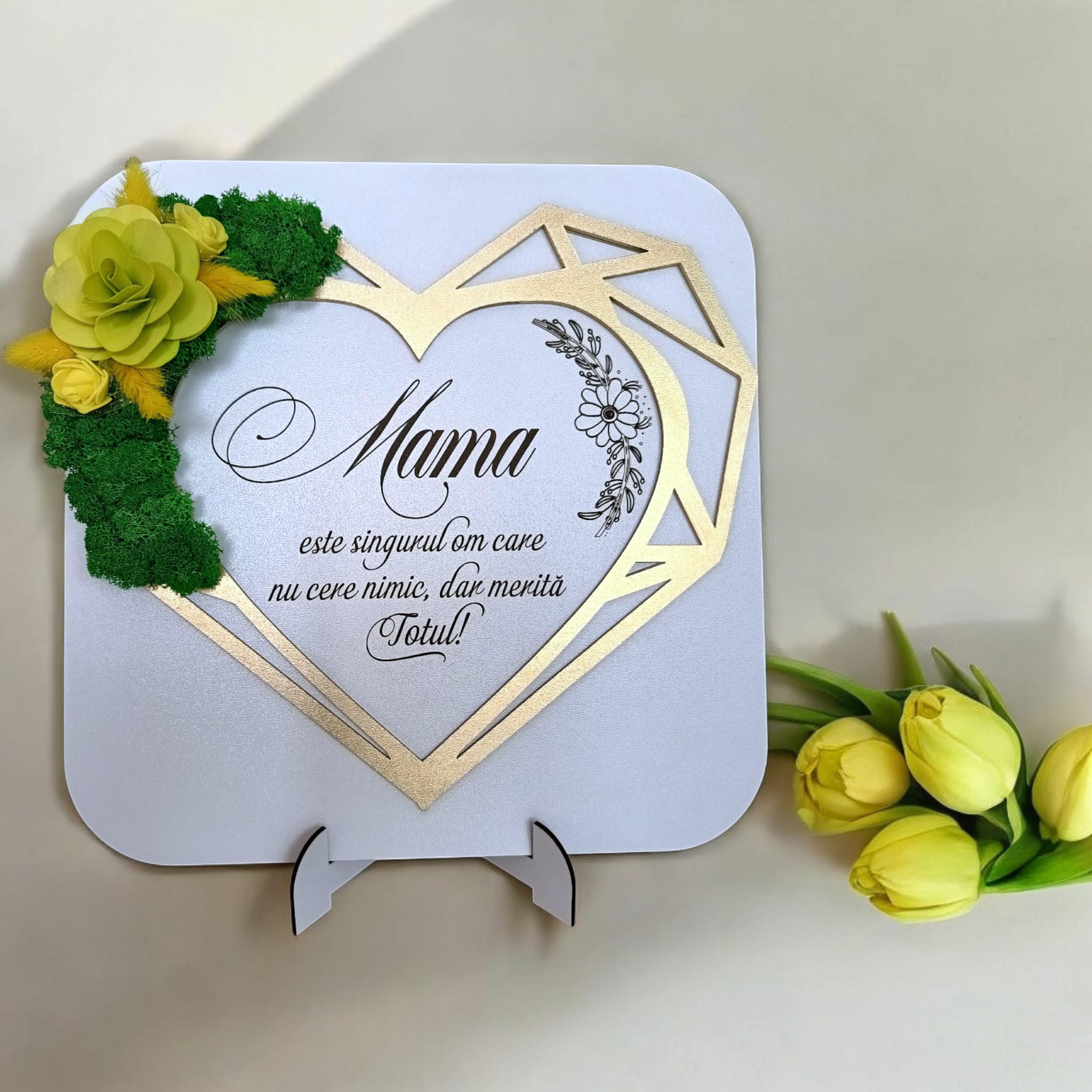 Tablou decorativ personalizat pentru Mama, decorat cu licheni stabilizati, cu design in formă de inimă geometrica– Produs în România de Rustic Wood Decor